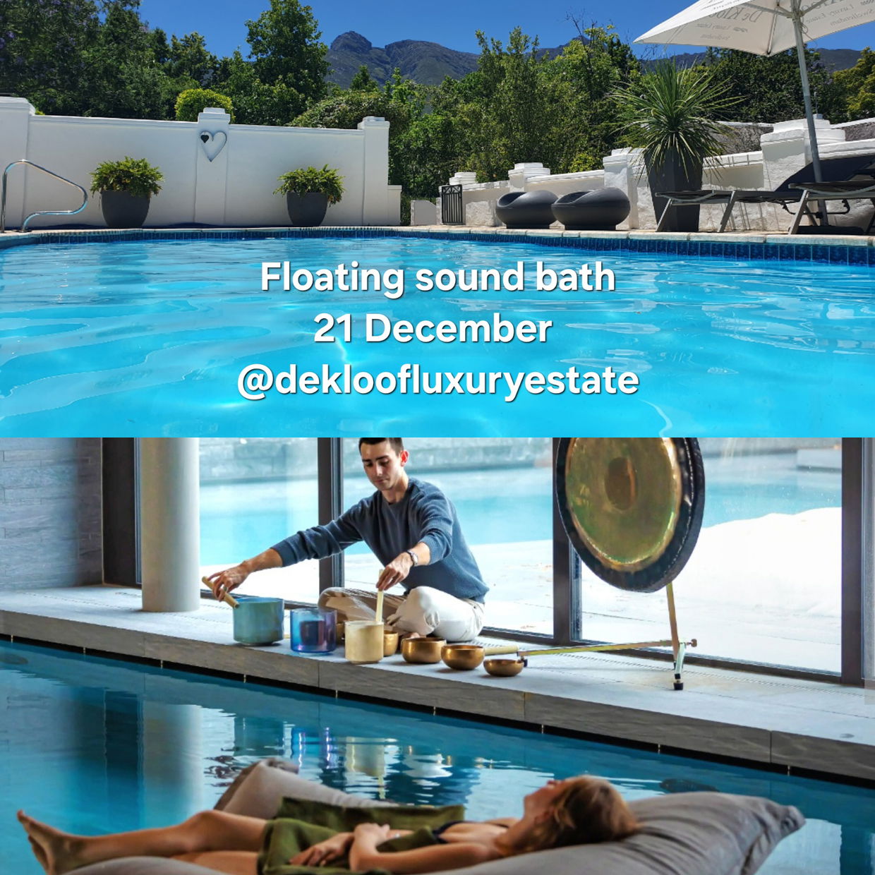 You will experience the amazing frequencies and vibration of this 38inch planetary tuned Paiste Sun Gong while floating around in the sparkling swimming pool at De Kloof heritage hotel on a buoyancy mat.